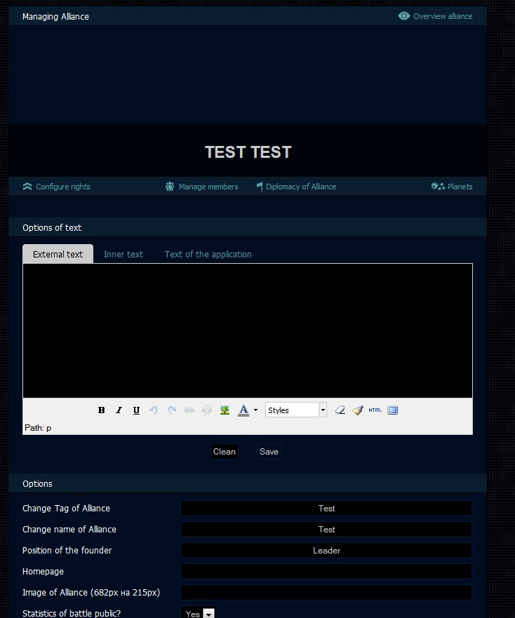 - External text - in this field you can write text that are visible as members of your alliance and ordinary players from another alliance.