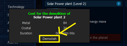 Important: The demolition of a buildings is not free. It costs the half of the price for the improvement of that level. Now, how to carry out the demolition of buildings: