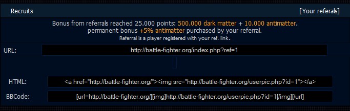 Recently, whe have added a referral banners that you can place on other sites. This banner redirect to the main page of the game. Banners, as well as regular link contain your unique ID, for which it will enroll you of a referral.